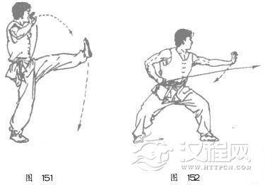 ②右腿伸直独立支撑,左腿屈膝抬起,以脚跟为力点向前蹬出, 挺膝勾脚, 腿高于胯; 目视前( 方 图1 5 1 ) 。