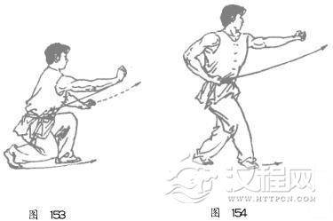 ②右腿向前跟进半步,双腿屈膝下蹲成跪步;同时右虎爪直线向前推出,臂与肩平,手心朝前;左虎爪收至右肘下内侧, 手心朝右; 目视右虎( 爪 图1 5 3 ) 。