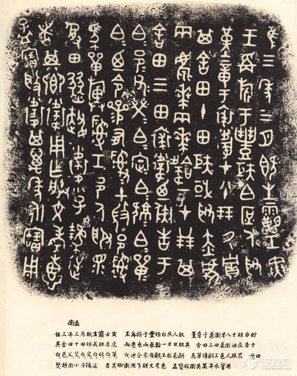 卫盉 西周恭王 通高二九、口径二〇.二厘米。一九七五年二月陕西岐山董家村西周窖藏出土 岐山县博物馆藏 器形是西周中期前段流行的式样。器颈和盖缘均饰回顾式花冠龙纹,盖上增饰弦纹一道,腹部有两道折線纹,流管饰三角雷纹。盖内铸铭文一百三十二字,是一篇研究西周中期土地制底和社会经济的极其重要的史料,大意是:恭王三年矩伯因参加周王建大常典礼,向裘卫取了价值八十朋的朝觐用玉章,答应给裘卫土地十田,后又取了赤琥、麂韨、贲□等玉饰礼服,答应给裘卫土地三田。裘卫把这件事报告给伯邑父、荣伯、定伯、□伯和单伯等执政大臣,于是,这些大臣命令三有司会同矩伯和裘卫办理交接手续。