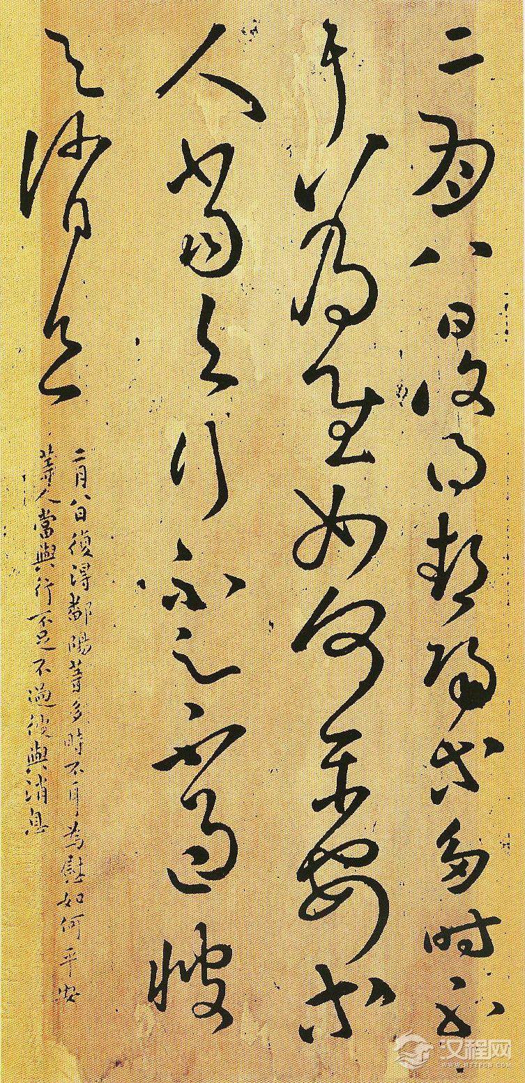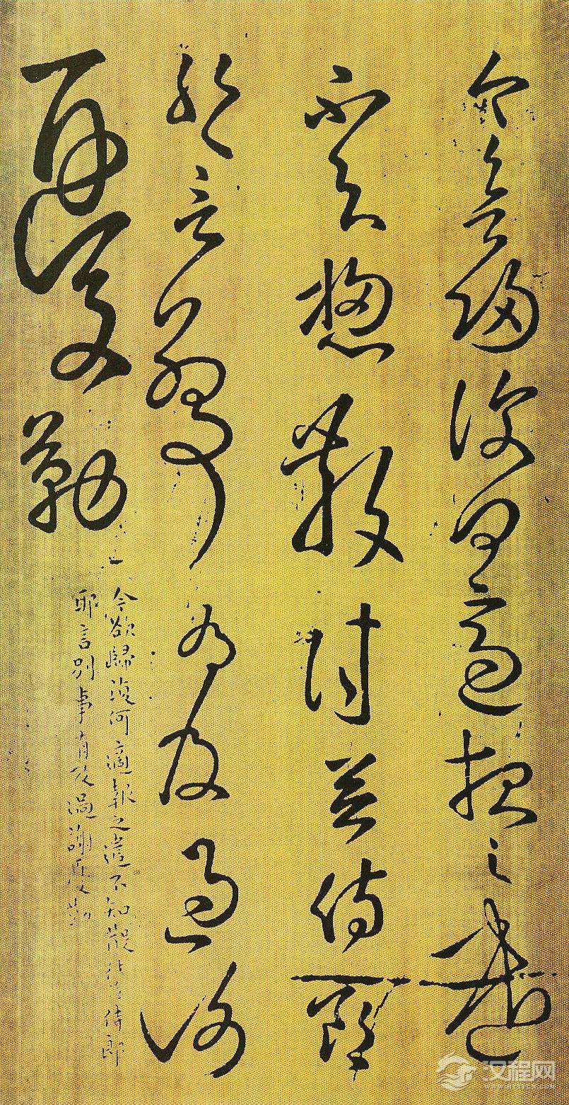 《今欲归帖》传为张芝之作,或为唐张旭所作。纸本。 此作线条虚实关系较好,点画处与引带处有明显的不同。点画萦绕以曲线为主,偶尔出现的直线又起到了强其体势的作用。 结字大小不求一律。如果把第一行的“之”放在一起,是会令人咋舌的,但它们在此作中并无不妥之处,可见作者高超的整体把握能力。 通篇来看,行气流畅,气势贯通。仔细审视,相连之字并不多。其中微妙是很值得我们体会的。