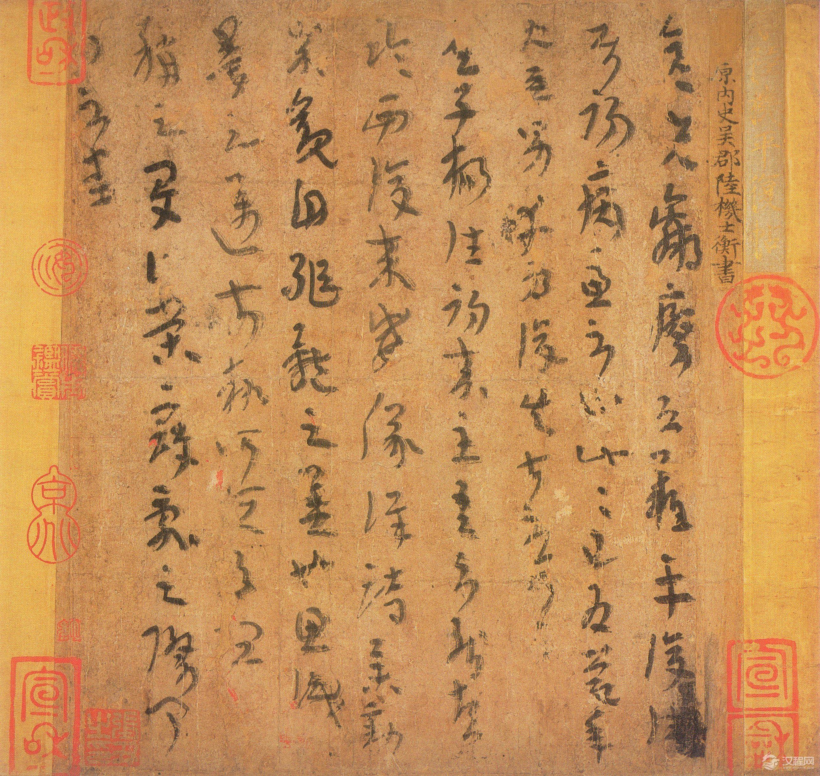 《平复帖》,西晋陆机书。章草。纸本。9行86字。纵23.8厘米,横20.5厘米。藏故宫博物院。