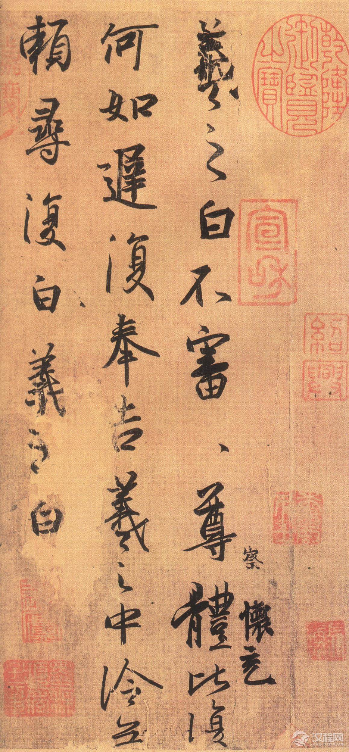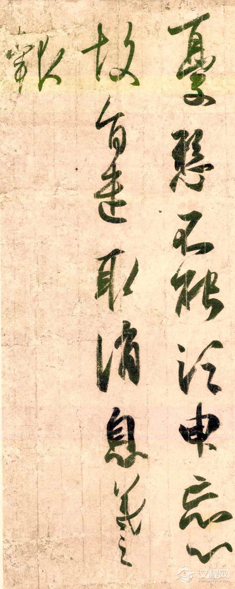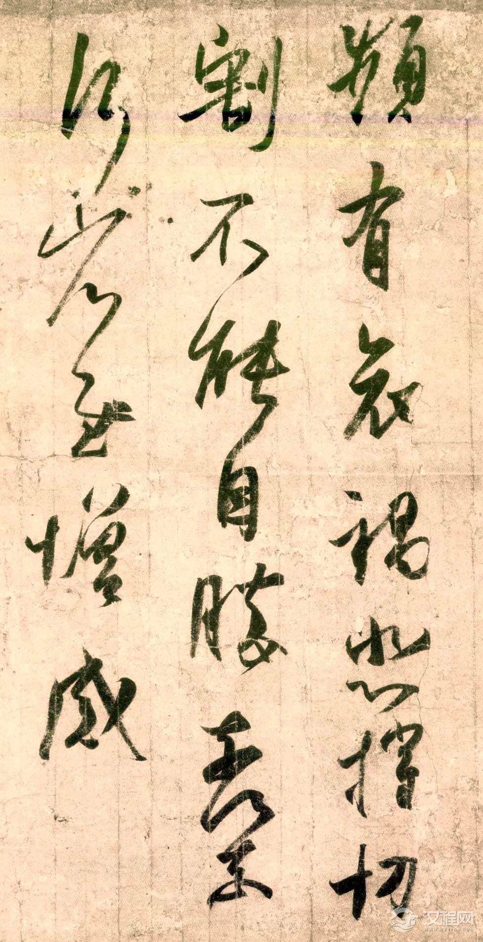 《频有哀祸帖》草书,纸本,现藏于日本前田育德会。字间倾侧、俯仰、钩连,笔画轻疾、圆转、牵引,结体多有取横势者。