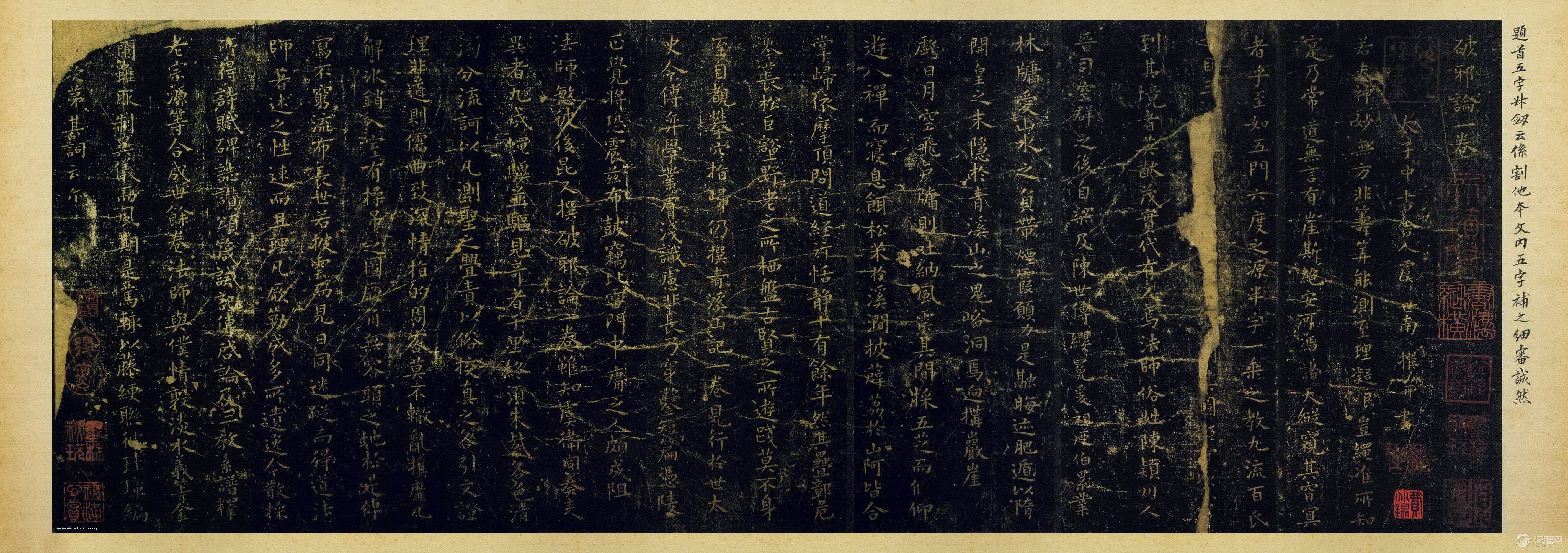 《破邪论序》虞世南小楷书,日本三井高坚收藏,全文收入《虞秘监集》及历代书法论著中,传世刻本有款署“太子中书舍人虞世南撰并书”“太子中书舍人吴郡虞世南撰并书”二种。但此帖有人疑为伪迹,如清代学者姚鼎认为虞世南父名荔,而文中有“饵松茶干溪漳,披薜荔于山阿”之句,未将其中“荔”字缺笔避讳。然此小楷之清逸,明王世贞《弇州山人续稿》中曾这样论述,“世南书迹本自稀,而楷法尤不易得,不者唯《破邪论序》,稍大者《孔子庙堂碑》而已,《破邪》积能之极,几夺天巧,所以不入二王室,犹似不能忘情于蹊迳耳。”此帖历来转辗翻刻者不少,如《玉烟堂帖》、《停云帖》、《清鉴堂》等诸法帖,尤以《越州石氏本》为最佳。