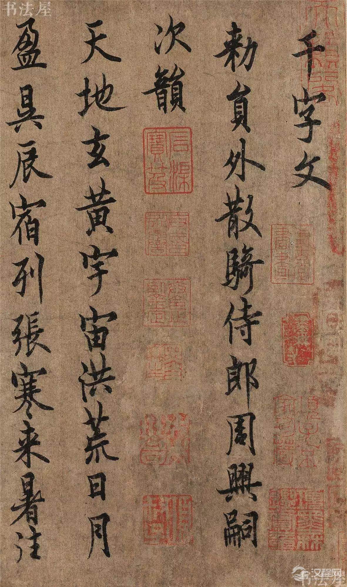 欧阳询书《千字文》,见于著录的共有三本:一为蔡襄题识过的《草书千字文》,一为南宋初期扬无咎藏的《楷书千字文》,一为现存的这本千字文。帖后仅存王诜跋:“东坡云,欧阳率更书非托于偏险,无所措其奇。其末流遂至李国主辈五降之后,不容弹矣。仆非唯爱此评,又爱其笔札瑰伟,遂白主人而取之。主人自有好事之病,怜我病更甚,故取之而不拒之也。晋卿书。”