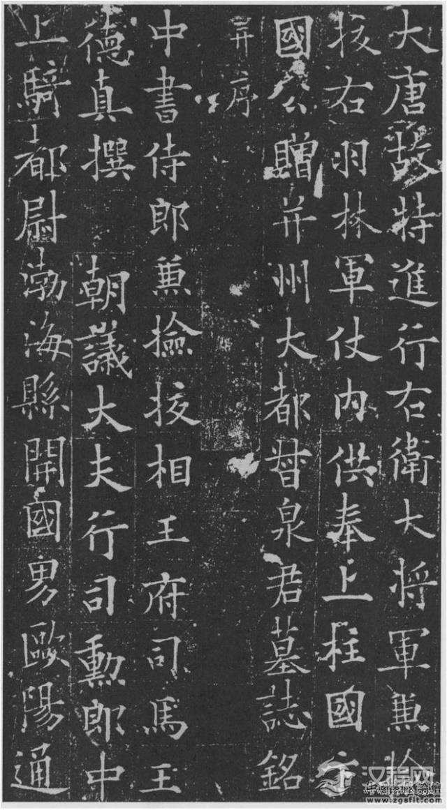 1921年在河南洛阳城北东岭头村出土。曾归陶北溟,北溟欲转售日本人,为张风台以千元截回。后藏河南开封市博物馆。高92、宽91、厚12厘米,其上篆书“大唐故特进泉君墓志”。志文正书,首题“大唐故特进行右卫大将军兼检校右羽林军仗内供奉上柱国卞国公赠并州大都督泉君墓志铭并序”。文凡四十六行,满行四十七字。书法严整峻美,恣肆奇倔,有其父欧阳询之风。此刻晚于《道因法师碑》十六年,故书益臻苍劲。有中华书局石印本,原石现藏河南省图书馆。