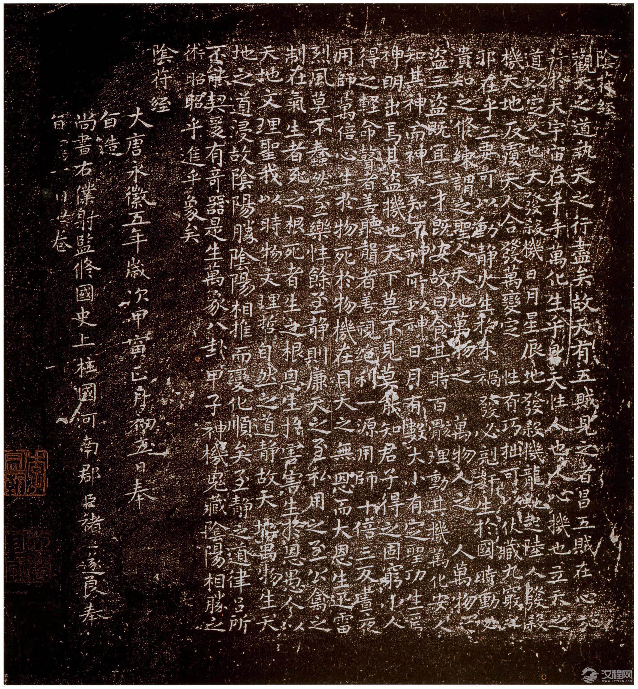 据说褚遂良奉旨书写的《阴符经》,有一百九十卷之多。此帖《小字阴符经》为著名的越州石氏帖刻本,其字小如豆,刻工精良。是褚遂良五十九岁时所写。