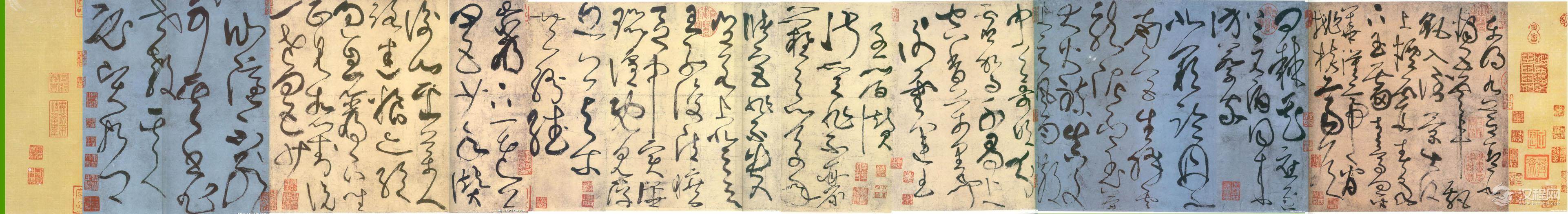 张旭《古诗四帖》墨迹本,五色笺,狂草书。纵28.8厘米,横192.3厘米。凡40行,188字。无款,前两首是庾信的《步虚词》,后两首是南朝谢灵运的《王子晋赞》和《四五少年赞》。明董其昌定为张旭书,后人多沿此说,但也颇有争议。董其昌依据是曾见过张旭所书《烟条诗》、《宛陵诗》,他说与《古诗四帖》的笔法相同,这二诗现在已经见不到了,连刻石拓本也无流传。