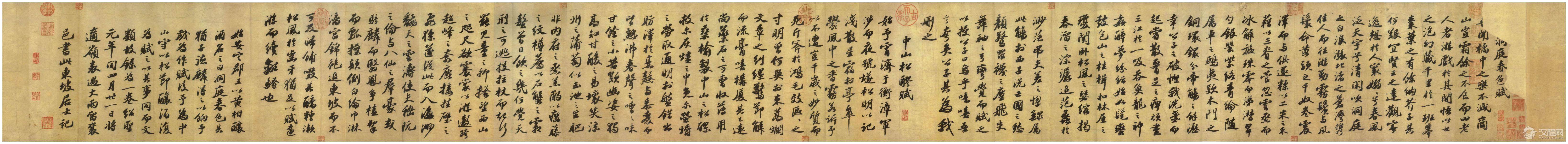 《洞庭春色赋》与《中山松醪赋》,均为苏轼撰并书,此两赋并后记,为白麻纸七纸接装,纸精墨佳,气色如新,纵28.3厘米,横306.3厘米,前者行书三十二行,二百八十七字;后者行书三十五行,三百十二字;又有自题十行,八十五字,前后总计六百八十四字,为所见其传世墨迹中字数最多者。前者作於公元1091年冬,后者作于公元1093年,为苏轼晚年所作,苏轼贬往岭南,在途中遇大雨留阻襄邑(今河南睢县)书此二赋述怀。自题云:“绍圣元年(1094)闰四月廿一日将适岭表,遇大雨,留襄邑,书此。”时年已五十九岁。