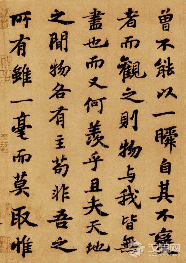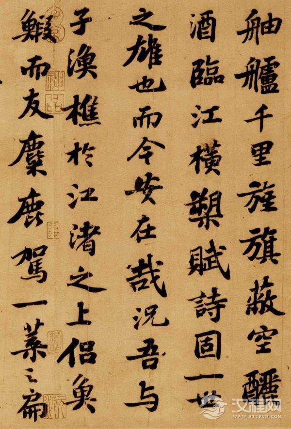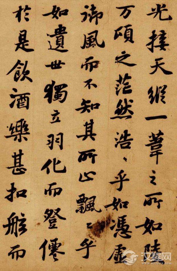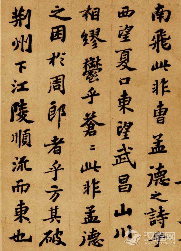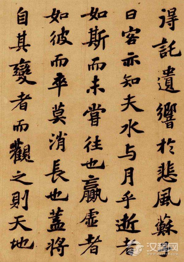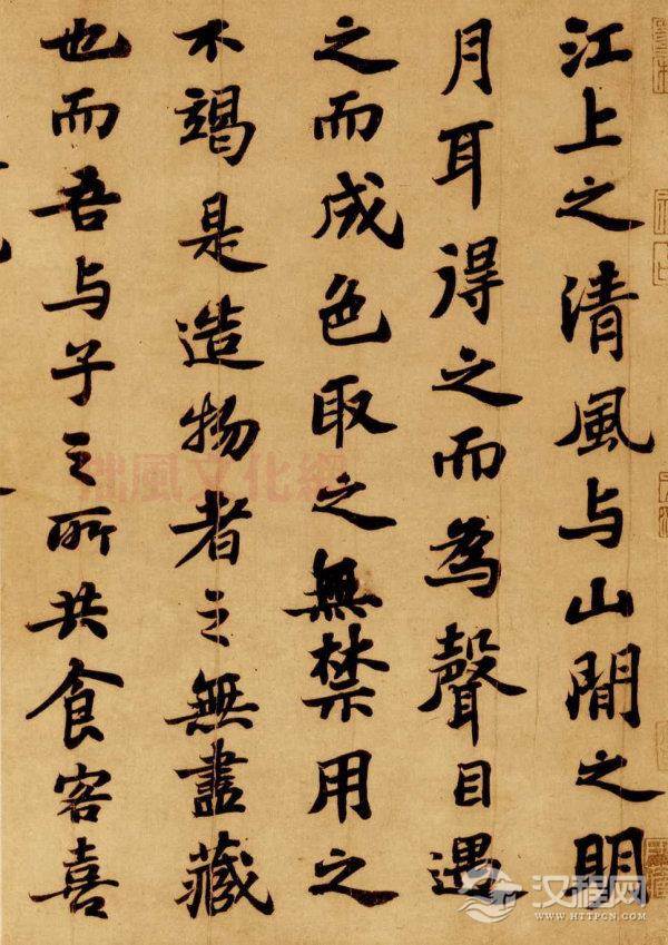 此卷行楷书,结字矮扁而紧密,笔墨丰润沉厚,是苏轼中年时期少见的用意之作。《石渠宝笈》载:卷高七寸五分,横七尺二寸五分。卷后有文徵明、董其昌等人跋,董跋称:“东坡先生此赋楚骚之一变,此书《兰亭》之一变也。”又称:“此赤壁赋庶几所谓欲透纸背者,乃全用正锋,是坡公之'兰亭’也。”此帖运笔古拙内涵,非寻常苏轼法书可比。