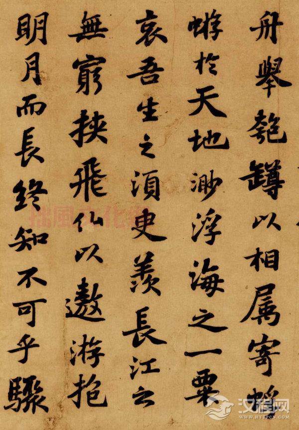 苏子愀然,正襟危坐,而问客曰:“何为其然也?”客曰:“月明星稀,乌鹊南飞,此非曹孟德之诗乎?西望夏口,东望武昌。山川相缪,郁乎苍苍;此非孟德之困于周郎者乎?方其破荆州,下江陵,顺流而东也,舳舻千里,旌旗蔽空,酾酒临江,横槊赋诗;固一世之雄也,而今安在哉?况吾与子,渔樵于江渚之上,侣鱼虾而友糜鹿,驾一叶之扁舟,举匏樽以相属;寄蜉蝣与天地,渺沧海之一粟。哀吾生之须臾,羡长江之无穷;挟飞仙以遨游,抱明月而长终;知不可乎骤得,托遗响于悲风。”
