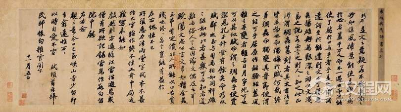 此卷为苏轼于元符三年(1100)冬十二月写给友人谢民师的一封信,谈他对文学遣词达意的见解。明陈继儒题跋:“东坡碑版照四裔,不如尺牍天真烂漫。所谓'吾写字觉元气十指间拂拂飞出’,此卷等是也。”