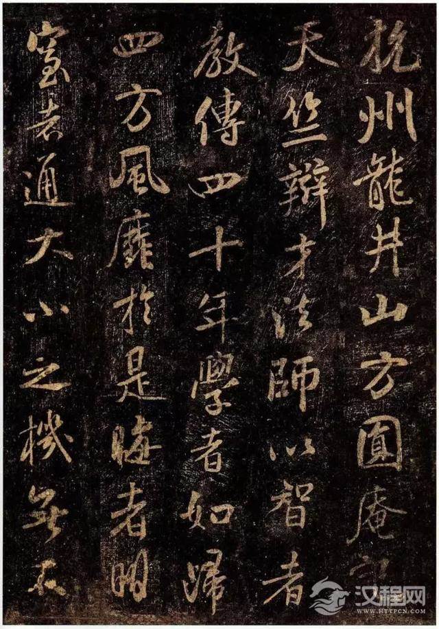 《方圆庵记》,宋元丰六年(1083)四月九日,杭州南山僧官守一法师到龙井寿圣院辩才住所方圆庵拜会辩才,二人讲经说法,谈古论经,十分投机。为此,守一写了《龙井山方圆庵记》一文,以示纪念。此碑由米芾书。原石于北宋元丰六年(1083年)刻。书法腴润秀逸,乃米芾“集古字”时期佳作,多从集王圣教出,是距离王羲之最近的作品,颇有可玩味处。