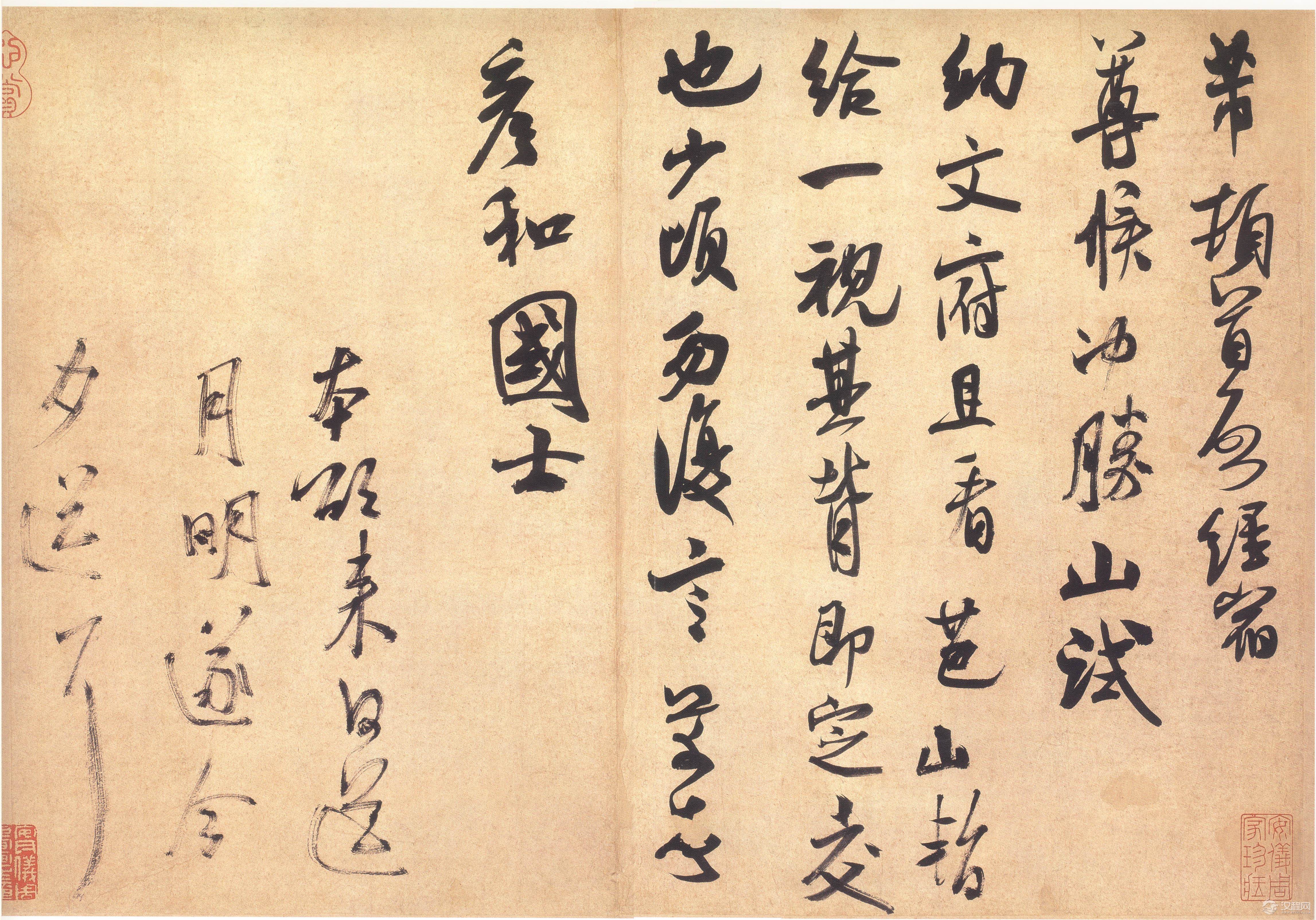 【释文】芾顿首启。经宿。尊候冲胜。山试纳文府。且看芭山。暂给一视其背。即定交也。少顷。勿复言。芾顿首彦和国士。本欲来日送。月明。遂今夕送耳。