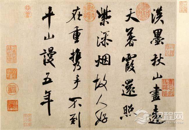 这件“淡墨秋山诗帖”流传有绪,历代著录于《墨缘汇观》、《石渠宝笈续编》,刻入《三希堂法帖》。此帖运笔如刷,笔力雄健,结态造势宽展肥美,当为米芾中年书法之精品。