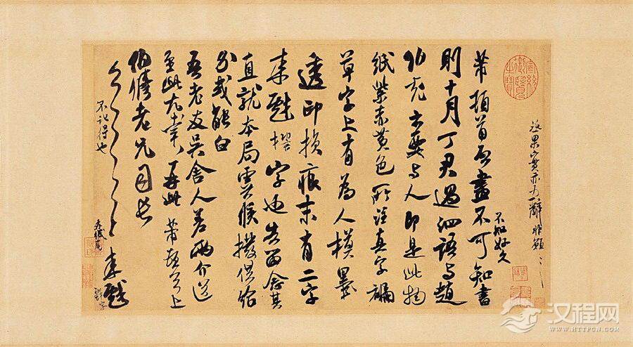 释文:(前补书:丞果实,亦力辞,非愿非愿)芾顿首启:画不可知(旁注:不知好久),书则十月丁君过泗,语与赵伯充,云要与人,即是此物。纸紫赤黄色,所注真字,褊草字,上有为人模墨透印损痕。末有二字: “"来戏”,*才字也。告留。念其直就本局虞候拨供给办。或能白吾老友吾舍人,差两介送至此,尤幸尤幸!再此。芾顿首上,伯修老兄司长。……不记得也。存纸尾。来戏,*才字。