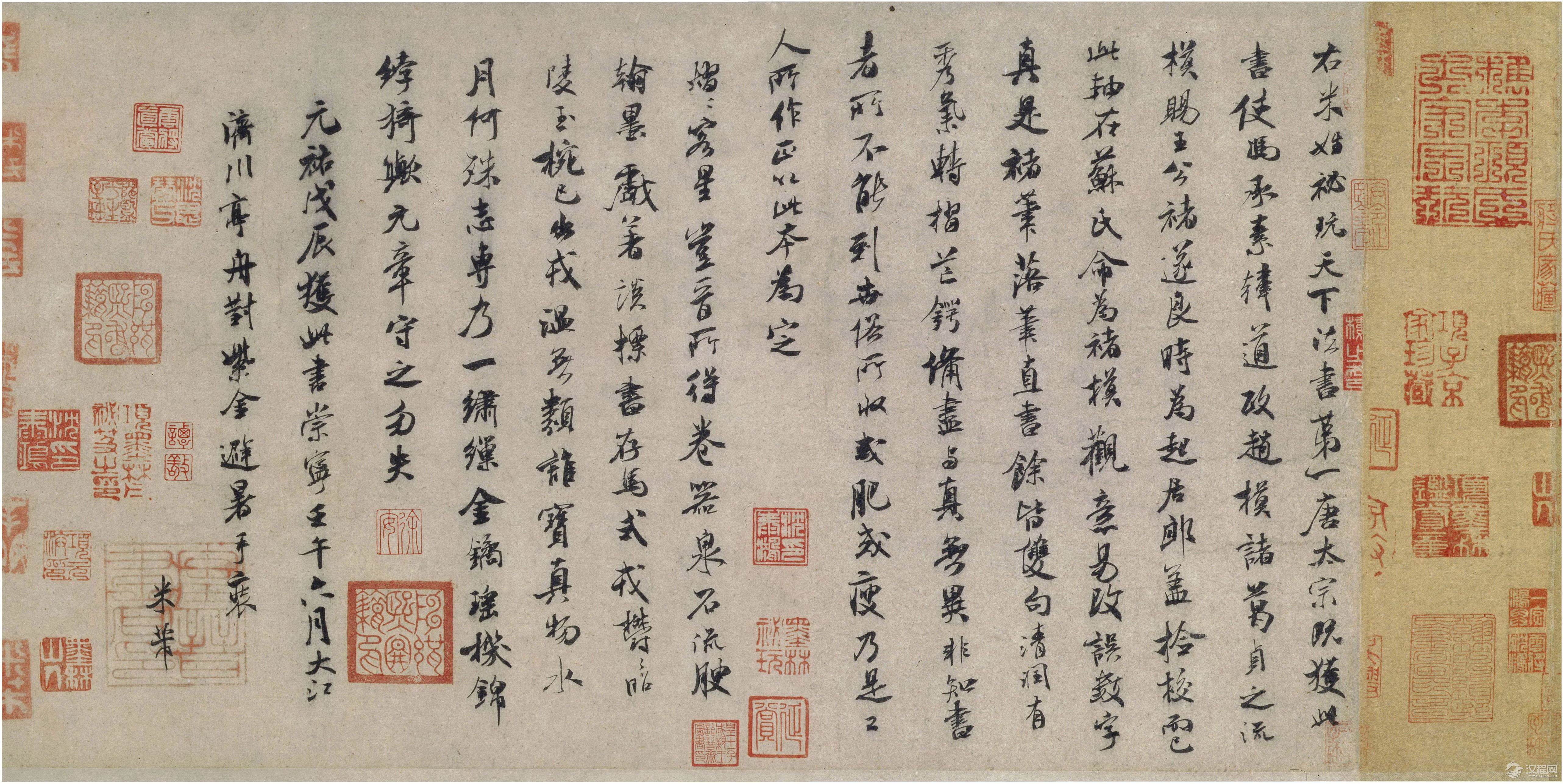 释文:右米姓秘玩,天下法书第一。唐太宗既获此书,使冯承素、韩道政、赵模、诸葛贞之流,摹赐王公。褚遂良时为起居郎,盖检校而已。此轴在苏氏,命为褚摹。观意易改误数字,真是褚笔,落笔直书。余皆双钩,清润有秀气,转摺芒锷备尽,与真无异,非知书者所不能到。世俗所收,或肥或瘦,乃是工人所作,正以此本为定。熠熠客星,岂晋所得。卷器泉石,流腴翰墨。戏著谈标,书存马式(戎)。郁郁昭陵,玉椀已出。戎温无类,谁宝真物。水月何殊,志专乃一。绣缫金鐍,瑶机绵绰。猗欤元章,守之勿失。元祐戊辰获此书。崇宁壬午六月,大江济川亭舟对紫金避暑手装。米芾。