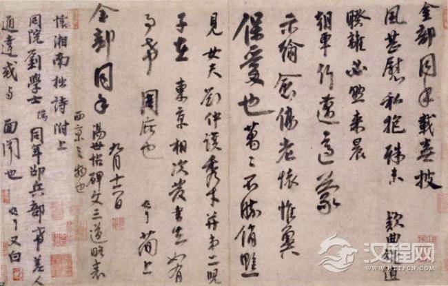 这是李建中写给“金部同年”的一封信,主要是托他照顾在东京汴梁的女婿刘仲谟与其次子李周士。“金部”属户部,“同年”是指同榜科举者。李建中也曾在金部供职,而此时正在西京洛阳作官,所以帖中说“略表西京之物”。此帖书法用笔苍老圆厚,形体紧结取敛势,圆转飘逸。后人评价:“西台(指李建中)书去唐人未远,犹有唐人余风。”其书风实开宋人尚意之先声,若与个性鲜明的宋诸家相较,则以典重温润取胜。