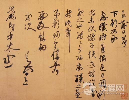 这幅以草书写成的尺牍,运笔与结体明显受到二王的影响。通幅体势雄健,虽然笔笔跳荡,多见游丝相连,显得有些秀美,但由于点画与转折处都相当有力,因此可说兼具了骨力与姿媚,是赵孟坚的代表作之一。