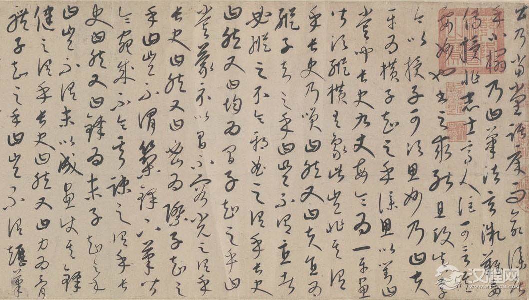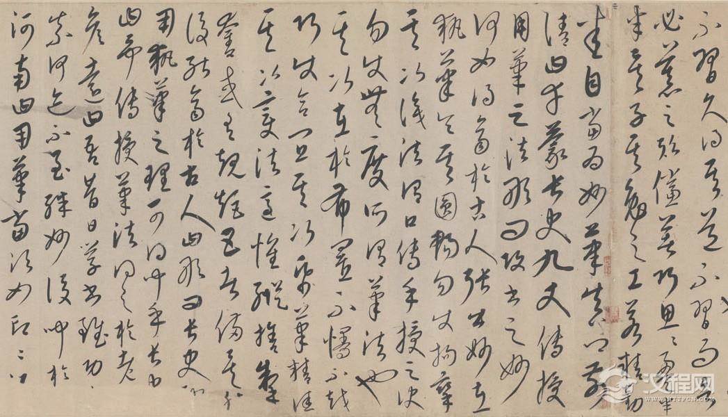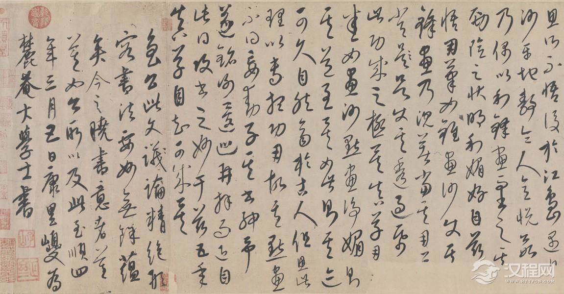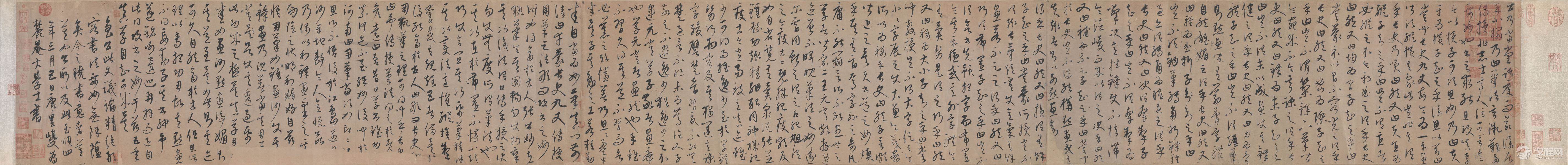 康里巎巙《述笔法卷》,草书。元统元年(1333年)书。按,康里于此作自题“至顺四年”,然文宗至顺仅三年。文宗至顺三年卒,宁宗继位,翌年惠宗立,改元统,是至顺四年即元统元年。