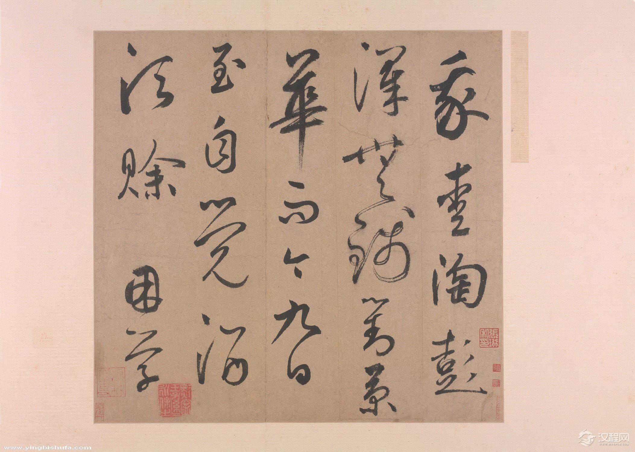 此页书唐代杜甫《复愁》十二首之十一(文字与通行版本略有不同)。结字开张,行笔遒劲,尺幅虽小,却足以代表鲜于氏英伟豪迈、痛快淋漓的书法风格。