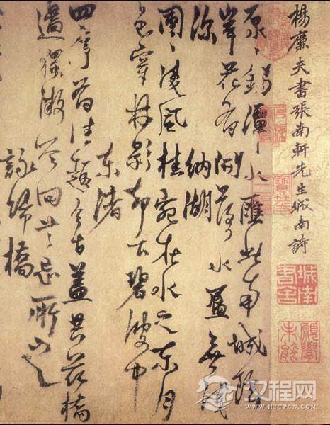 杨维桢《城南唱和诗卷》,行草书。论元代书法形态的奇崛古朴,杨维桢当数第一。这与他倔强的个性、深厚的学养又联系在一起所以,非常人所及。杨维桢的行草书,其风格在元代书史上也是独树一帜的。元代章草的复兴是从赵、邓开始的,但他们未能对章草这种书体作出什么创新,而以章草笔法杂以汉隶和今草笔法成功运用到行草书创作并形成自己独特风格的,独有杨维桢一人。《城南唱和诗卷》,对章草笔意的运用达到了随心所欲、挥洒自如的境界。杨维桢把晋唐楷法和汉隶、章草、今草笔法融合在一起,故独有奇拙、古朴的趣味。所谓“矫杰横发”(李东阳)“狂怪不经”(徐有贞)“大将班师,三军奏凯。破斧缺斨,例载而归”(吴宽)就是指杨维桢书风中豪迈雄强、形态怪异、用笔粗放的特点。而这种激越奔放的气势,刀斫斧劈的雄强,正是筑基于章草笔法的渗入。