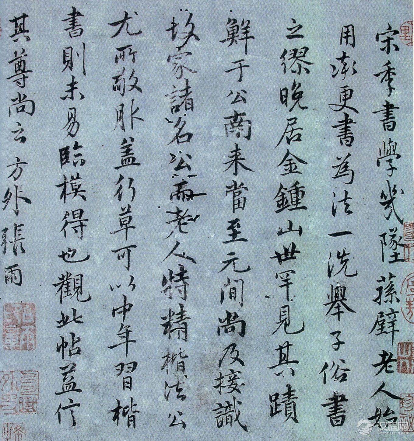 【释文】宋季書學幾墜.荪壁老人始用率更書為法,一洗舉子俗書之(缪)谬。晚居金锺山,世罕見其蹟。鲜于公南來,當至元間,尚及接識故家諸名公,而老人特精楷法,公尤所敬服。盖行草可以中年習,楷書則未易臨模得也。觀此帖益信其尊尚云。方外張雨。