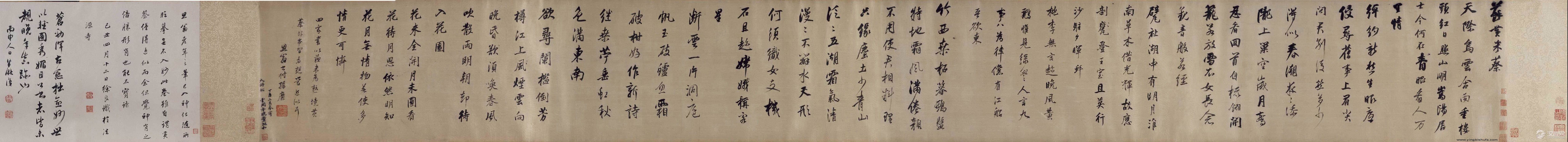 释文:苏、黄、米、蔡。天际乌云含雨重,楼头红日照山明。嵩阳居士今何在,青眼看人万里情。绰约新愁生眼底,侵寻旧事上眉尖。问君别后愁多少,得似春潮夜夜添。陇上巢空岁月惊,忍看回首自梳翎。开笼若放雪衣女,长念观音般若经。甓社湖中有明月,淮南草木借光辉。故应剖蚌登王室,且莫行沙驻夕晖。桃李无言趁晚风,黄鹂惟见绿匆匆。人言九事八为律,傥有江船吾欲东。竹西桑柘暮鸦盘,特地霜风满倦颜。不用使君相料理,只缘尘土少青山。泛泛五湖霜气清,漫漫不辨水天形。何须织女支机石,且趁嫦娥称客星。断云一片洞庭帆,玉破鲈鱼霜破柑。好作新诗继桑苎,垂虹秋色满东南。欲寻阑槛倒芳樽,江上烟云向晚昏。须唤春风吹散雨,明朝却待入花园。花未全开月未圆,看花待月思依然。明知花月无情物,若使多情更可怜。四家书以苏米为熟境,黄蔡非串习者想当近似耳。思翁书付孙广。
