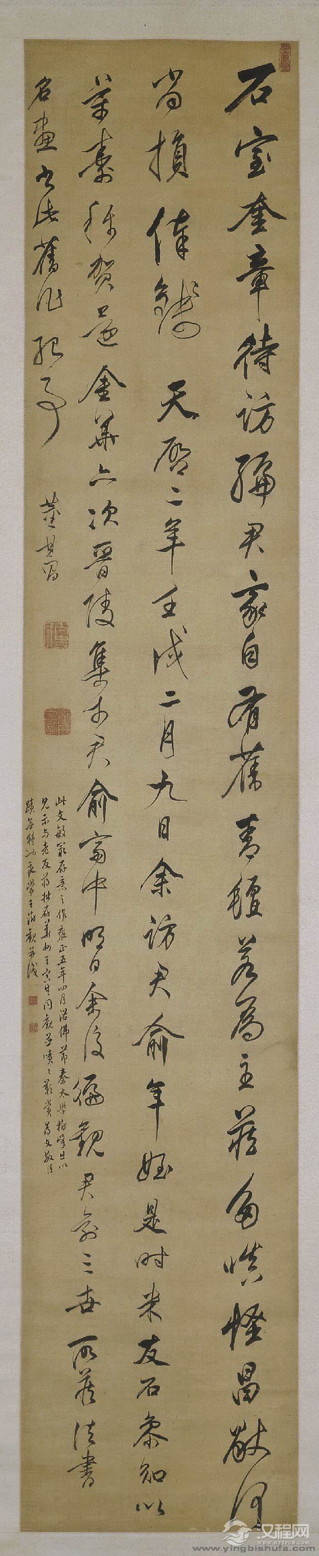 董其昌《自书七绝诗轴》,绫本,行书,纵256cm,横48.4cm。北京故宫博物院藏。