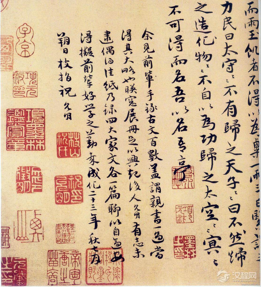余见前辈手录古文百数,盖谓亲书一过,尝得其大略也。映窗展册,足以兴起,后人允明,有志未逮,偶得佳纸,乃录四家文各一篇,聊以自适,安得拟前辈好学之勤哉?成化二十三年秋七月朔日枝指祝允明。