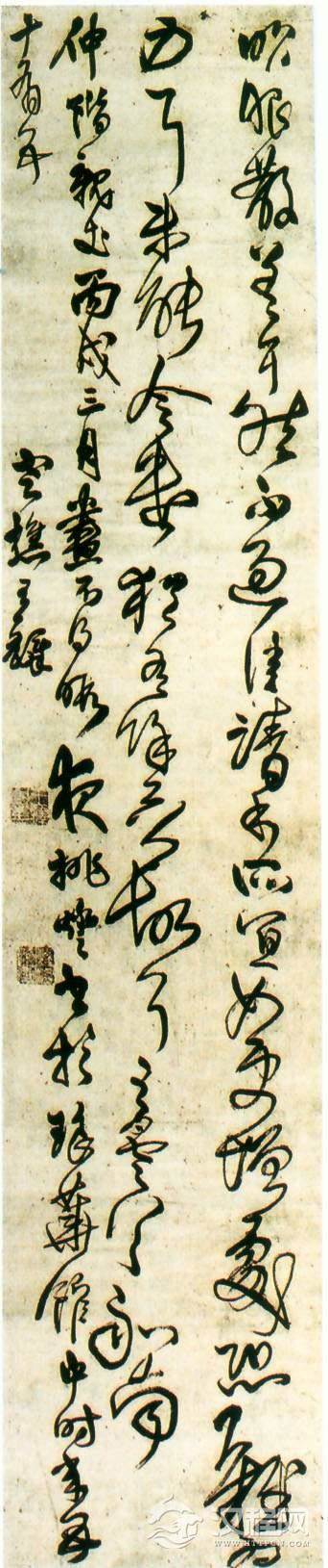 王铎《临王昙首昨服散帖》(五十五岁作)自署书于丙戌年(清顺治三年,1646年),草书绢本,文语一则。凡四行,共68字。纵227cm,横47cm。广州美术馆藏。