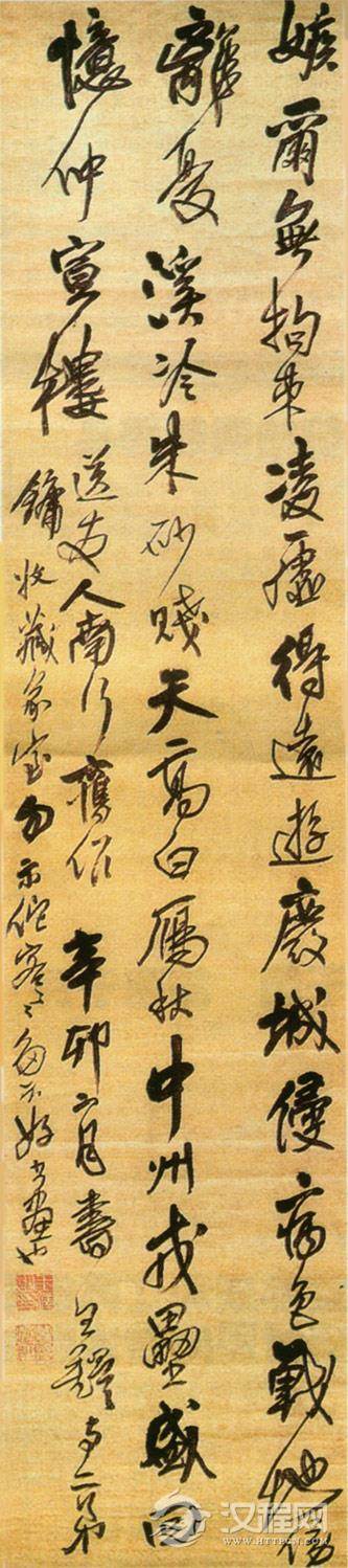 王铎《行书五绝立轴》。墨迹绫本。纵225厘米,横51.5厘米。
