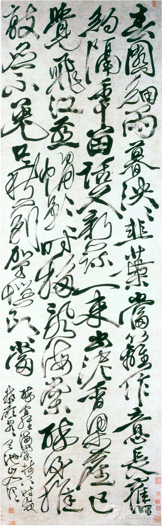 《七律诗轴》徐渭书,草书,纸本。纵209.8厘米,横64.3厘米,4行。故宫博物院藏。书法笔势酣畅,锐气十足,用笔纵肆淋漓,放浪开张,满纸云烟,摄人心魄。