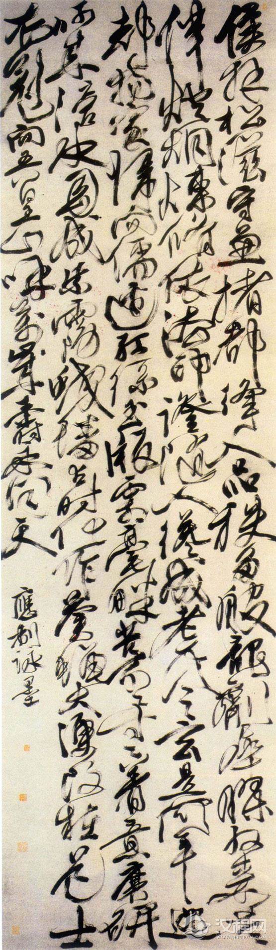 徐渭《应制咏墨轴》,行草纸本,纵352厘米,横102.6厘米,苏州博物馆藏。其书法棱角毕露,不避败锋,点画支离,结构破碎,布局散乱,而强心铁骨,其中一种磊落不平之气,宛然可见。这与其晚年“乐难顿段,得乐时零碎乐些;苦无尽头,到苦处休言苦极”之悲愤、压抑、无奈的心境相合,故见情见性,真挚感人,允为神品。