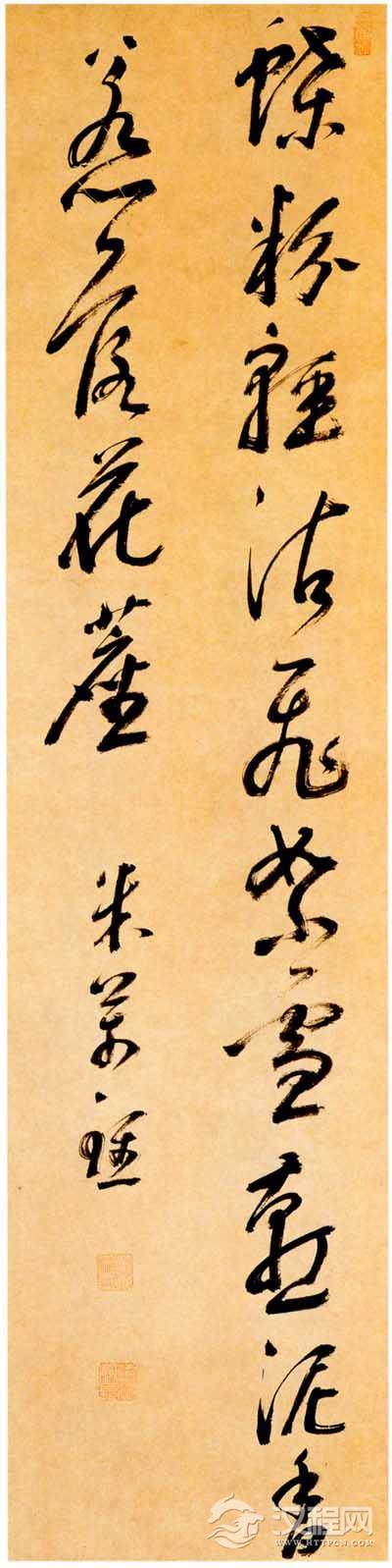 此轴书法奇纵放逸,闲散平实,行笔迅疾潇洒,线条牵萦连属,顾盼呼应,俯仰向背,和谐有致,结体宽博丰劲,显示了米万钟长于大字书法的独特风格。