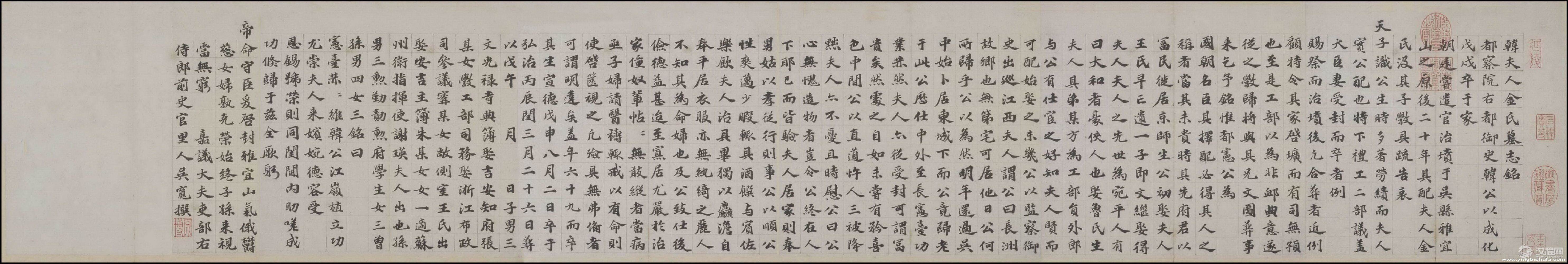 吴宽的书法源于颜真卿、苏轼,虽得其天真润美之态,而又有自己宽博开阔之势。为故去的人书写墓志铭是比较严肃之事,所以书体的结构大都比较紧密,字体方整,气势庄严,而吴宽书法的特点也正是如此,端庄浑厚。