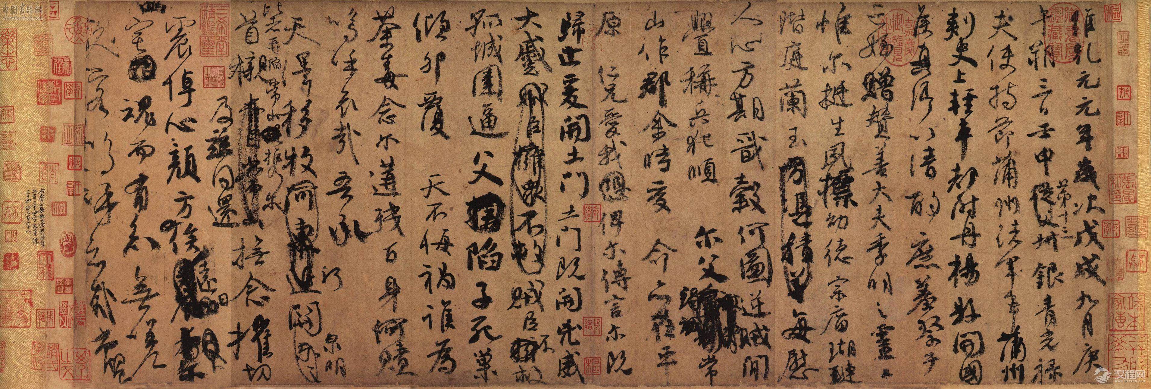 《祭侄稿》全称《祭侄季明文稿》,书于唐乾元元年(公元七百五十八年)。麻纸本,行书 纵28.2厘米 横75.5厘米,二十三行,每行十一二字不等,共二百三十四字。铃有“赵氏子昴氏”、“大雅”、“鲜于”、“枢”、“鲜于枢伯几父”、“鲜于”等印。曾经宋宣和内府、元张晏、鲜于枢、明吴廷、清徐乾学、王鸿绪、清内府等收藏,现藏台北故宫博物院。