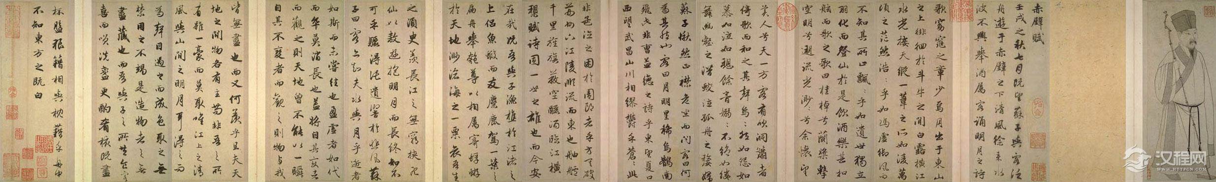 赵孟頫书苏轼《前赤壁赋》,并作东坡像于卷首。台北故宫博物院藏。