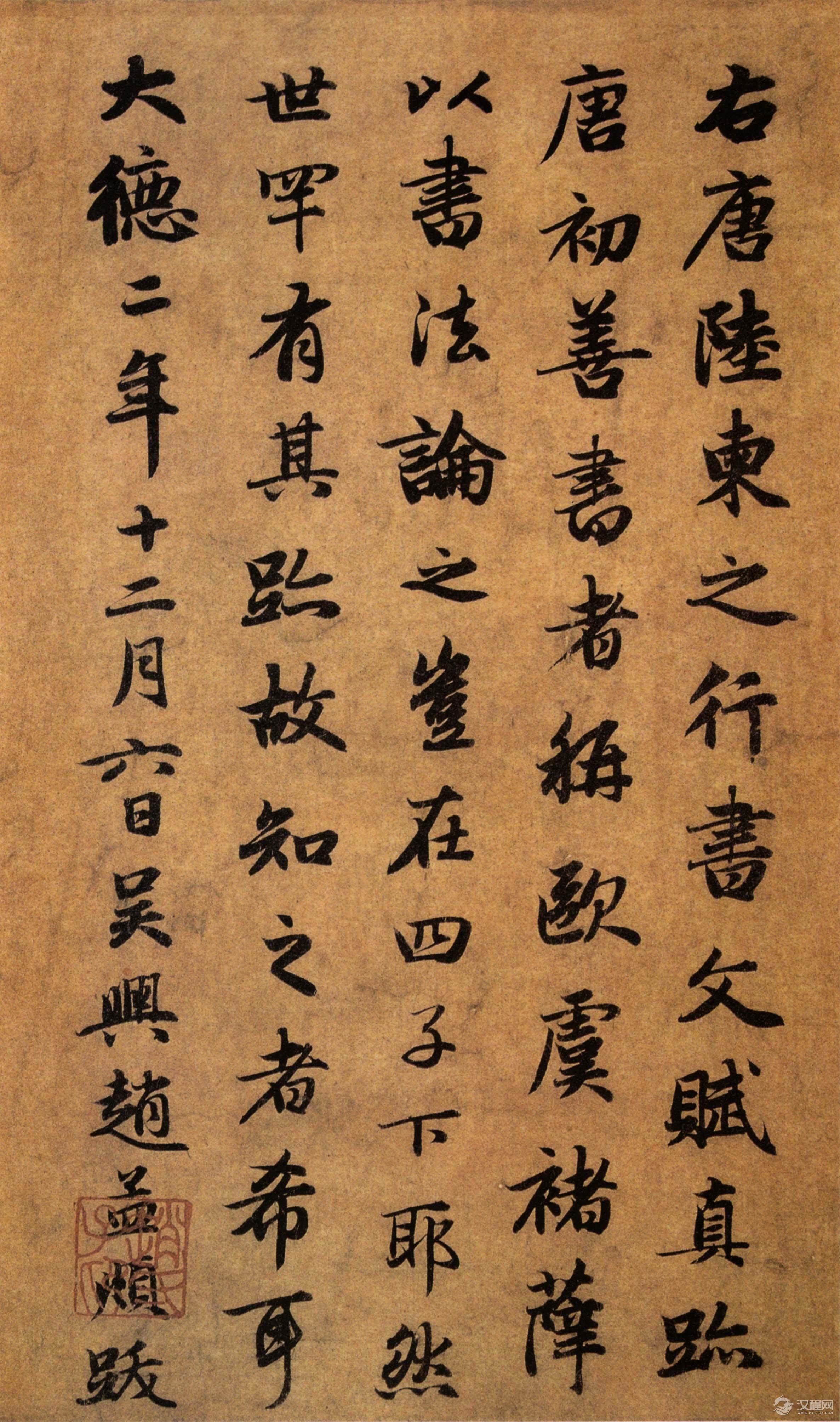 释文:右唐陆柬之行书文赋真迹,唐初善书者称欧虞褚薛,以书法论之,岂在四子下耶。然世罕有其迹,故知之者希耳。大德二年十二月六日,吴兴赵孟頫跋。