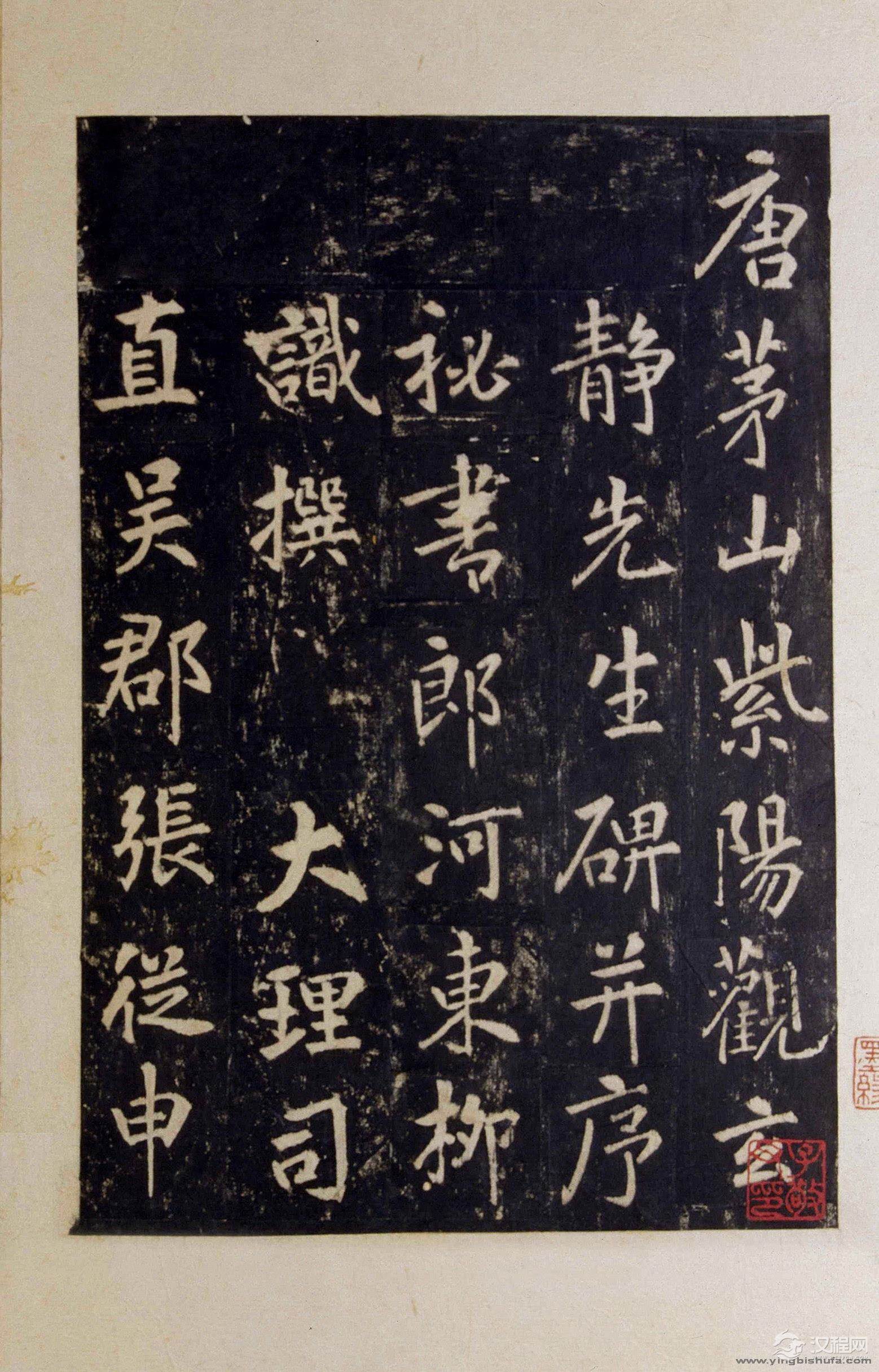 《李玄靖碑》又称为《玄靖先生李含光碑》,全称《唐茅山此阳观玄静先生碑》。唐代宗大历七年(772)八月十四日刻,由柳识撰,张从申书,李阳冰篆额。碑石原在江苏句容玉晨观,明世宗明嘉靖三年(1529年)毁于火,传世拓本甚稀,未见整纸本,字共八百三十五,原碑行数已不可知。