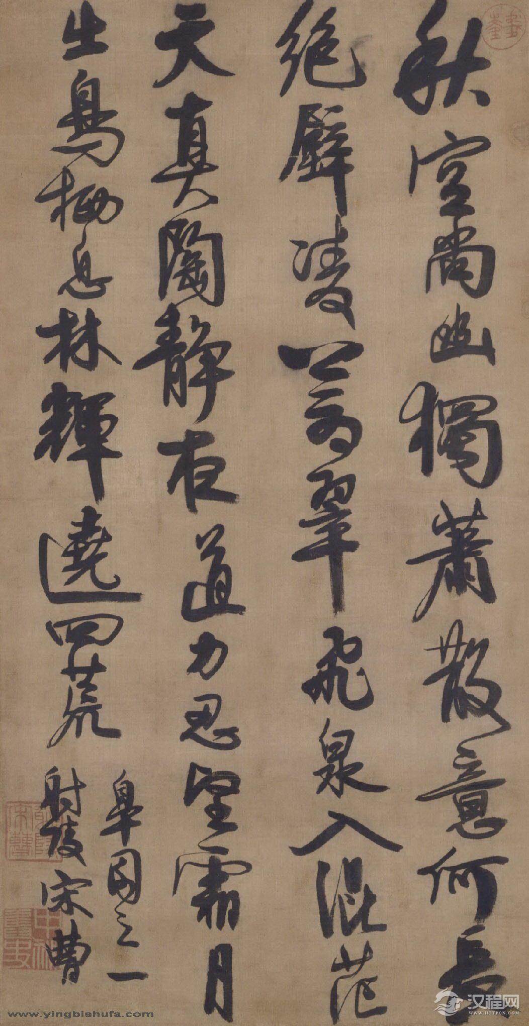 宋曹所擅长的行草书通常呈现两种风格,一种瘦劲雄秀,一种沉着厚重,后者较为常见。此轴属后种风格,用笔丰肥,墨色浓厚,笔力沉着,时出侧锋,为其典型风貌。(撰稿人:李艳霞)