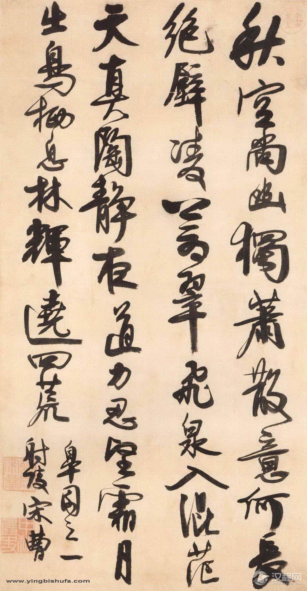 宋曹行草书有两种风格,一种瘦劲雄秀,一种沉着厚重,后者较为觉见。本幅即属此种风格,用笔丰肥,墨色浓厚,笔力沉着,时出侧铎,为其典型风貌。