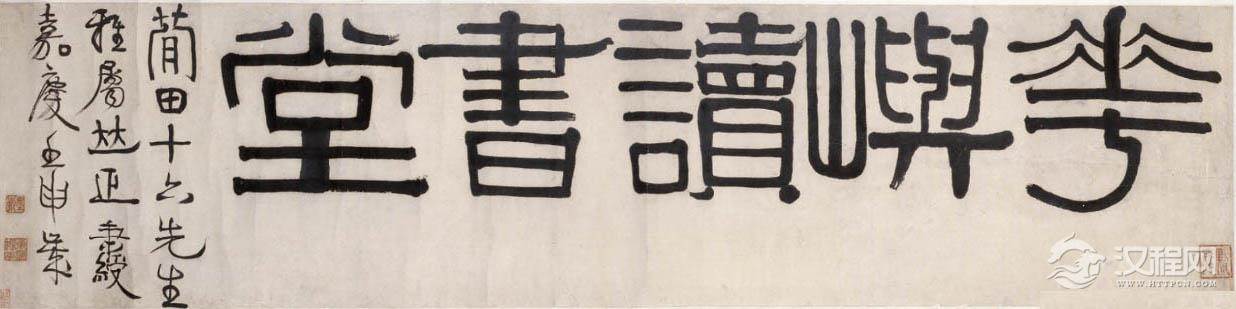 伊秉绶隶书横幅,纸本,纵32cm,横130.5cm。北京故宫博物院藏。此轴为横幅,隶书“華嶼讀書堂”五字,末识:“簡田十六先生雅屬並正,秉綬。嘉慶壬申歲。”左钤“墨卿”、“東閣梅花”印二方,右侧下角钤“墨庵”印,左下角钤“藥農平生真賞”收藏印。“嘉庆壬申”为清嘉庆十七年(1812年),作者时年60岁,此幅为其晚年所书。