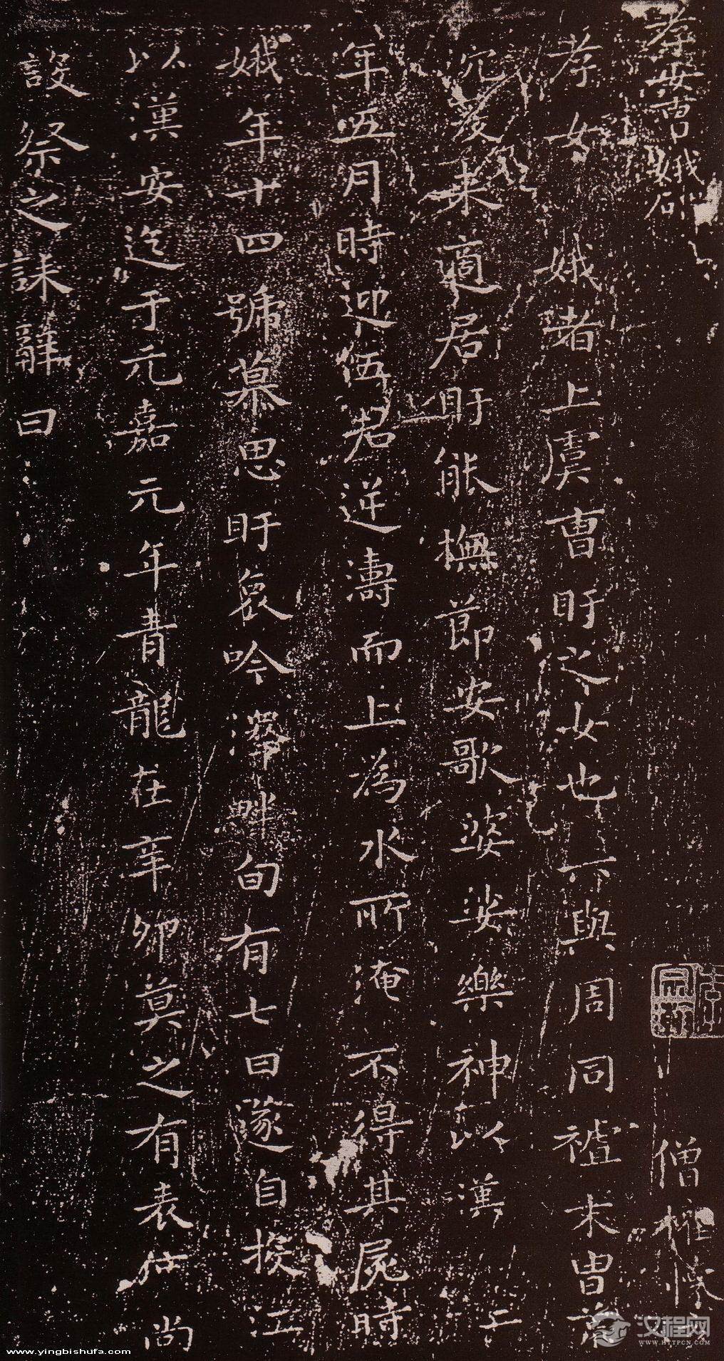 曹娥碑又称《孝女曹娥碑》,元嘉元年立,明人传为王羲之书。小楷,二十七行。此帖结字扁平,用笔多不藏锋,有隶书笔意。其章法自然,笔力劲健,结字跌宕有致,无求妍美之意,而具古朴天真之趣。应为唐以前人所书。