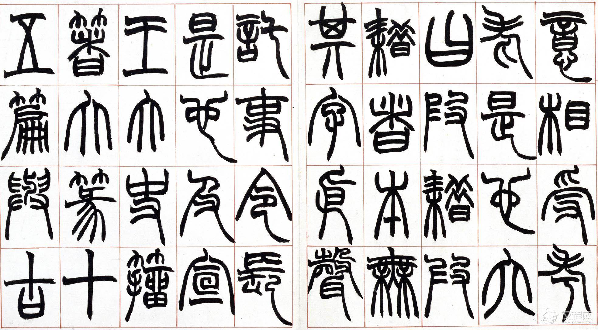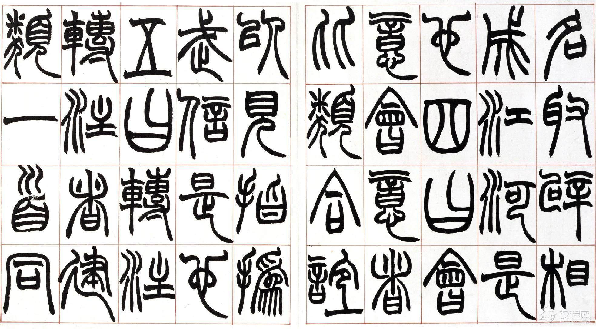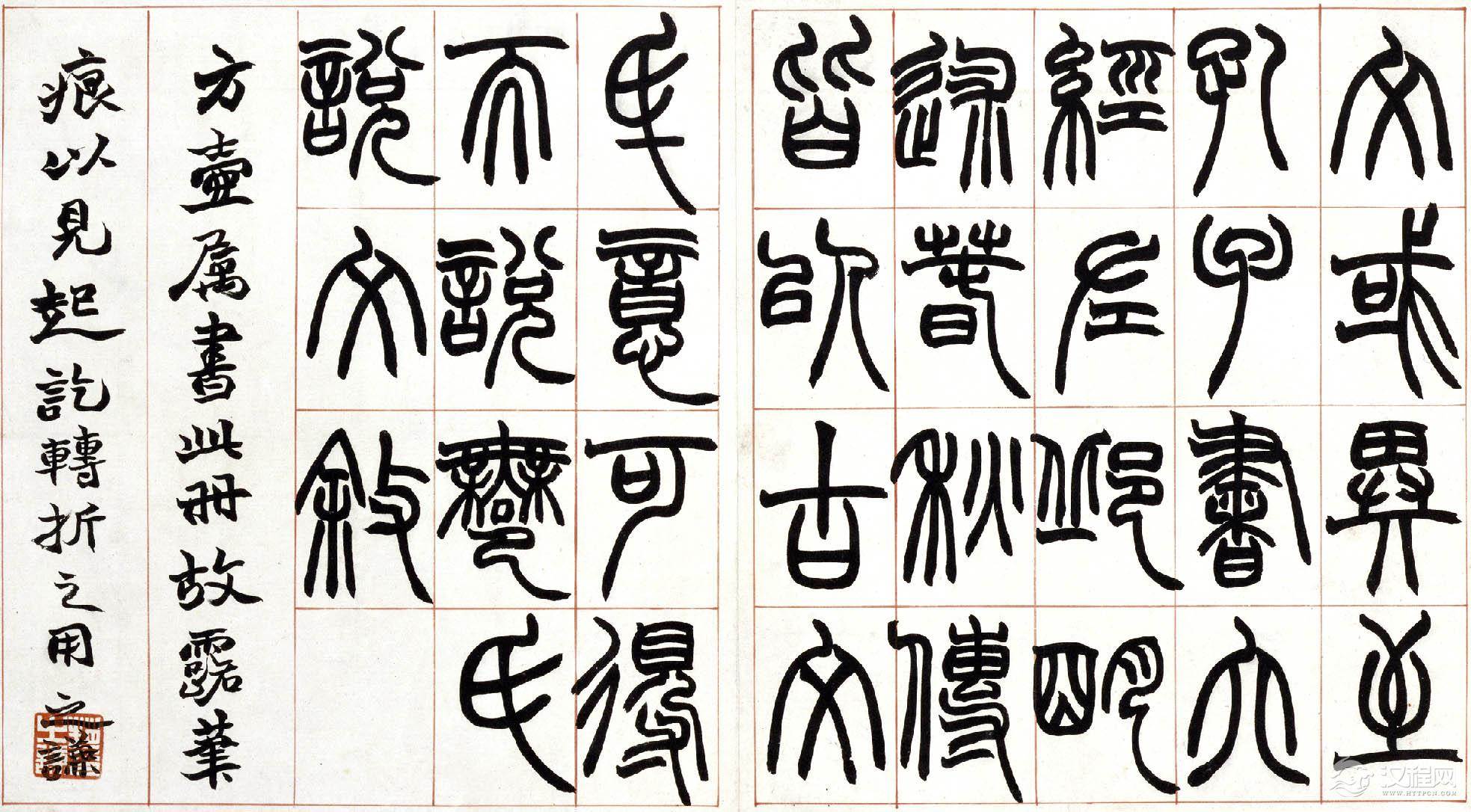 从赵之谦识语推测,此册当是为弟子习字用所书范本,上款"方壶"应为其弟子或爱其书者。此册书法结构谨严,篆法精丽,起讫之处未用藏锋,其意为使弟子易见笔法之踪痕,却获得了一种意外的效果,使之不同于一般篆书之圆润流美,自具特色。同时,此册笔力健劲,使转自如,将北碑书法融于篆书之中,也为赵氏书法之一大特色。本册具体书写时间不详,但从书法风格及为弟子书写范本的情况看,当为赵氏中年以后作品,是赵之谦具有代表性的篆书作品之一。