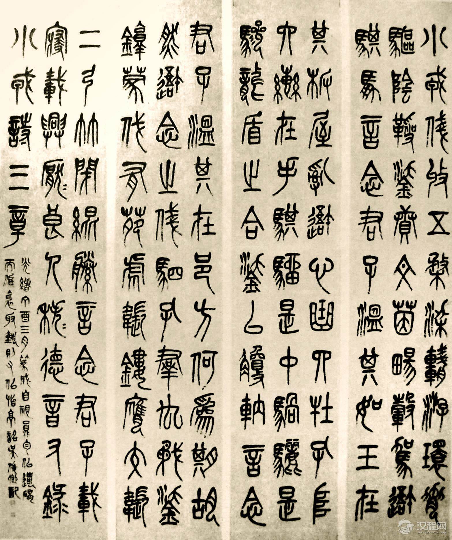 吴昌硕篆书小戎诗四条屏,光绪丁酉年(1897)吴氏五十四岁所作。上海博物馆藏。