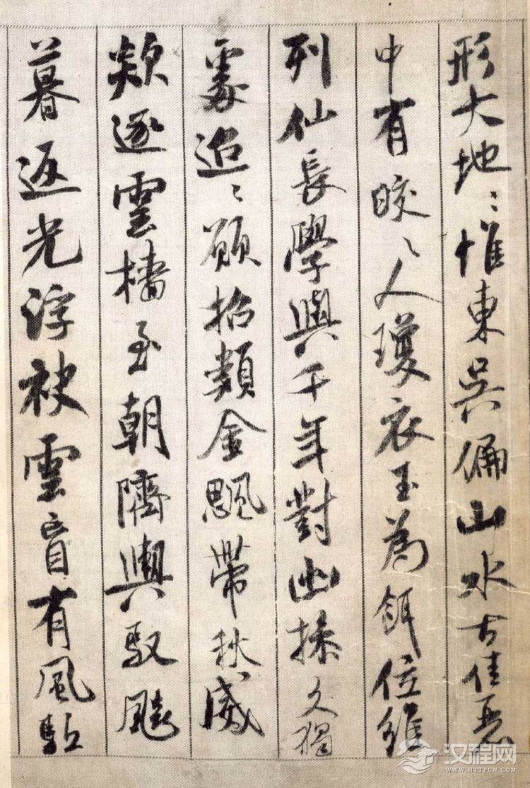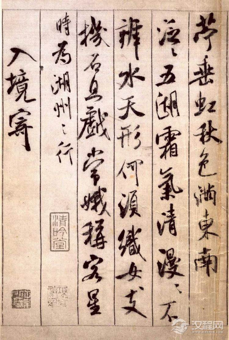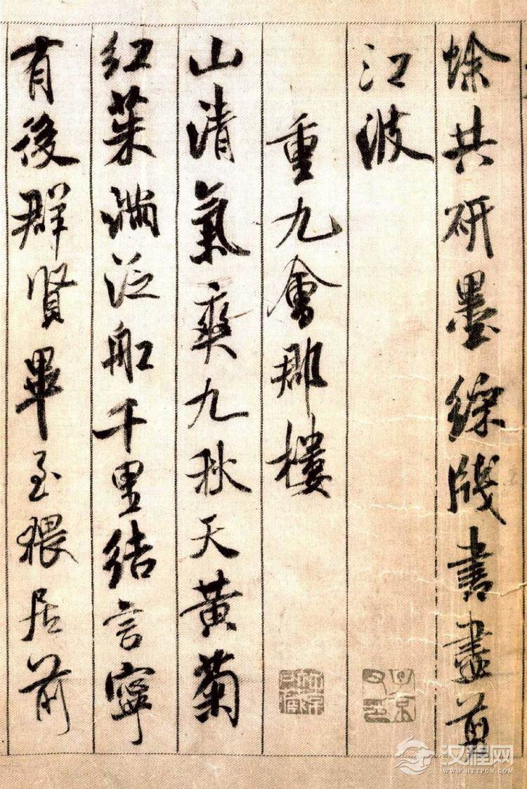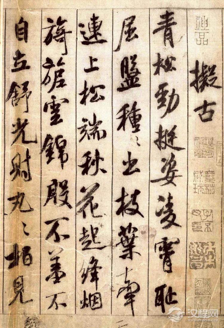 释文:拟古。青松劲挺姿。凌霄耻屈盘。种种出枝叶。牵连上松端。秋花起絳烟。旖旎云锦殷。不羞不自立。舒光射丸丸。柏见吐子效。鹤疑缩颈还。青松本无华。安得保岁寒。龟鹤年寿齐。羽介所託殊。种种是灵物。相得忘形躯。鹤有冲霄心。龟厌曳尾居。以竹两附口。相将上云衢。报汝慎勿语。一语堕泥涂。吴江垂虹亭作。断云一片洞庭帆。玉破鱸鱼霜金破柑。好作新诗继桑苧。垂虹秋色满东南。泛泛五湖霜气清。漫漫不辨水天形。何须织女支机石。且戏常娥称客星。时為湖州之行。入境寄集贤林舍人。扬帆载月远相过。佳气葱葱听诵歌。路不拾遗知政肃。野多滞穗是时和。天分秋暑资吟兴。晴献溪山入醉哦。便捉蟾蜍共研墨。綵牋书尽翦江波。重九会郡楼。山清气爽九秋天。黄菊红茱满泛船。千里结言寧有后。群贤毕至猥居前。杜郎闭客今焉是。谢守风流古所传。独把秋英缘底事。老来情味向诗偏。和林公峴山之作。皎皎中天月。团团径千里。震泽乃一水。所占已过二。娑罗即峴山。谬云形大地。地惟东吴偏。山水古佳丽。中有皎皎人。琼衣玉為珥。位维列仙长。学与千年对。幽掺久独处。迢迢愿招类。金颸带秋威。欻逐云檣至。朝隮舆驭飆。暮返光浮袂。云盲有风马?丘。蟾餮有刀利。亭亭太阴宫。无乃瞻星气。兴深夷险一。理洞轩裳偽。粉粉夸俗劳。坦坦忘怀易。浩浩将我行。蠢蠢须公起。送王焕之彦舟。集英春殿鸣梢歇。神武天临光下澈。鸿臚初唱第一声。白面王郎年十八。神武乐育天下造。不使敲抨使传道。衣锦东南第一州。棘璧湖山两清照。襄阳野老渔竿客。不爱纷华爱泉石。相逢不约约无逆。舆握古书同岸幘。淫朋嬖党初相慕。濯髮洒心求易虑。翩翩辽鹤云中侣。士苴尪鴟那一顾。邇来器业何深至。湛湛具区无底沚。可怜一点终不易。枉驾殷勤寻漫仕。漫仕平生四方走。多与英才并肩肘。少有俳辞能骂鬼。老学鴟夷漫存口。一官聊具三径资。取捨殊途莫迴首。元祐戊辰九月廿三日。溪堂米黻记。