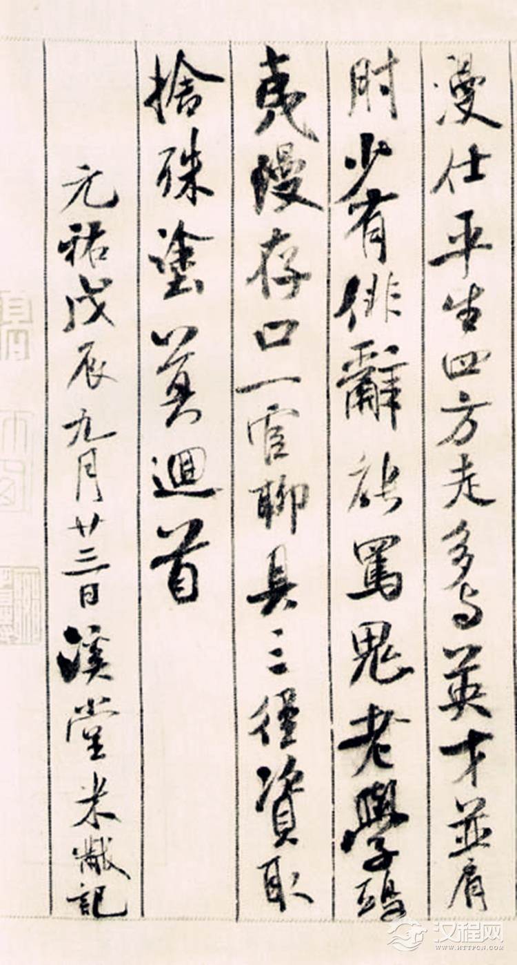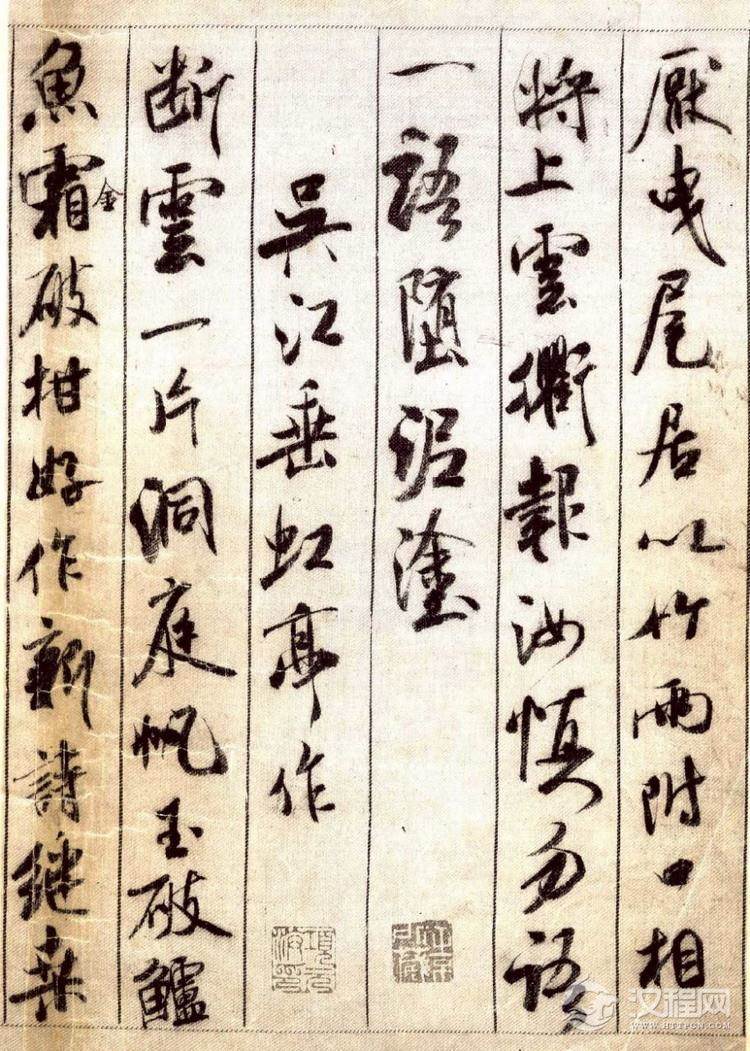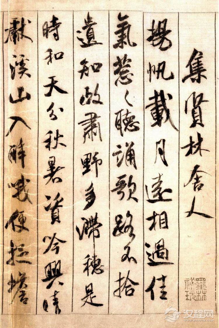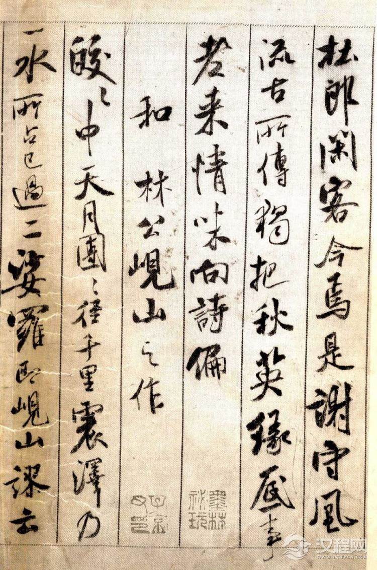 释文:拟古。青松劲挺姿。凌霄耻屈盘。种种出枝叶。牵连上松端。秋花起絳烟。旖旎云锦殷。不羞不自立。舒光射丸丸。柏见吐子效。鹤疑缩颈还。青松本无华。安得保岁寒。龟鹤年寿齐。羽介所託殊。种种是灵物。相得忘形躯。鹤有冲霄心。龟厌曳尾居。以竹两附口。相将上云衢。报汝慎勿语。一语堕泥涂。吴江垂虹亭作。断云一片洞庭帆。玉破鱸鱼霜金破柑。好作新诗继桑苧。垂虹秋色满东南。泛泛五湖霜气清。漫漫不辨水天形。何须织女支机石。且戏常娥称客星。时為湖州之行。入境寄集贤林舍人。扬帆载月远相过。佳气葱葱听诵歌。路不拾遗知政肃。野多滞穗是时和。天分秋暑资吟兴。晴献溪山入醉哦。便捉蟾蜍共研墨。綵牋书尽翦江波。重九会郡楼。山清气爽九秋天。黄菊红茱满泛船。千里结言寧有后。群贤毕至猥居前。杜郎闭客今焉是。谢守风流古所传。独把秋英缘底事。老来情味向诗偏。和林公峴山之作。皎皎中天月。团团径千里。震泽乃一水。所占已过二。娑罗即峴山。谬云形大地。地惟东吴偏。山水古佳丽。中有皎皎人。琼衣玉為珥。位维列仙长。学与千年对。幽掺久独处。迢迢愿招类。金颸带秋威。欻逐云檣至。朝隮舆驭飆。暮返光浮袂。云盲有风马?丘。蟾餮有刀利。亭亭太阴宫。无乃瞻星气。兴深夷险一。理洞轩裳偽。粉粉夸俗劳。坦坦忘怀易。浩浩将我行。蠢蠢须公起。送王焕之彦舟。集英春殿鸣梢歇。神武天临光下澈。鸿臚初唱第一声。白面王郎年十八。神武乐育天下造。不使敲抨使传道。衣锦东南第一州。棘璧湖山两清照。襄阳野老渔竿客。不爱纷华爱泉石。相逢不约约无逆。舆握古书同岸幘。淫朋嬖党初相慕。濯髮洒心求易虑。翩翩辽鹤云中侣。士苴尪鴟那一顾。邇来器业何深至。湛湛具区无底沚。可怜一点终不易。枉驾殷勤寻漫仕。漫仕平生四方走。多与英才并肩肘。少有俳辞能骂鬼。老学鴟夷漫存口。一官聊具三径资。取捨殊途莫迴首。元祐戊辰九月廿三日。溪堂米黻记。