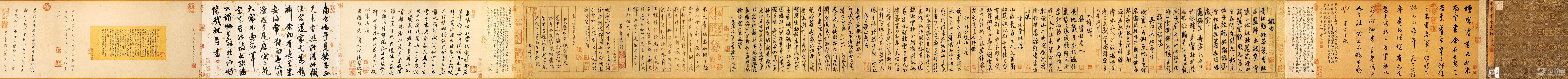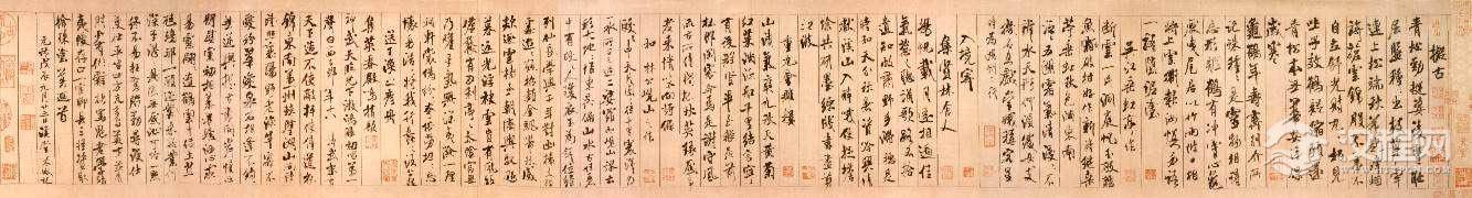 米芾《蜀素帖》,亦称《拟古诗帖》,墨迹绢本,行书。纵29.7厘米,横284.3厘米;书于宋哲宗元祐三年(1088),米芾三十八岁时,共书自作各体诗八首,计71行658字,署黻款。